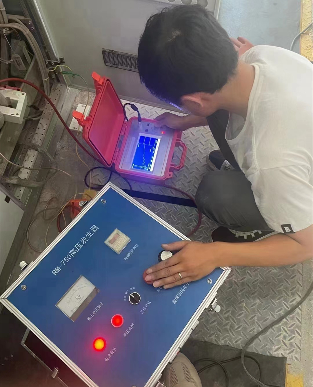 確定電纜全?后,??壓發(fā)?器多次打壓后查找近端有故障波形顯示的情況。?定點(diǎn)儀在故障端進(jìn)?定位。