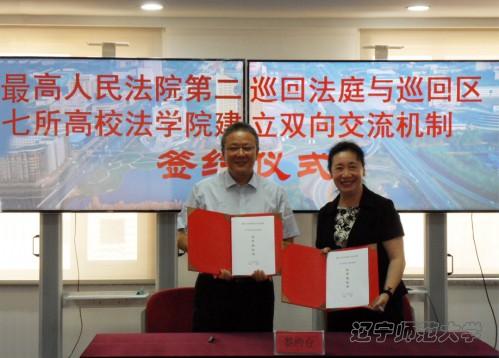 7月14日上午10点,最高人民法院审判委员会专职委员、第二巡回法庭庭长胡云腾与包括beat365官网法学院在内的巡回区内七所高校的法学院院长分别签订了合作协议书,beat365官网法学院院长丁慧教授和师生代表出席了签字仪式。这标志着第二巡回法庭与beat365官网在内的东三省各法学院校之间正式建立了双向交流合作机制。建立这项机制,旨在贯彻落实党的十八届四中全会精神和最高人民法院相关工作部署,创新法院与高校合作共赢新机制。